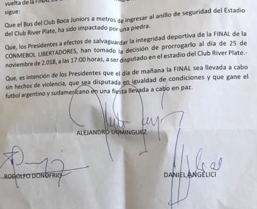 Pero, de acuerdo a informes de la prensa argentina, Conmebol y River Plate ya ven en Boca Juniors a un ‘traidor’, toda vez que el presidente xeneize firmó el sábado el acuerdo para que el partido se disputara el domingo junto a su homólogo ‘millonario’ Rodolfo D’Onofrio y el titular de la Confederación, Alejandro Domínguez. Por ello, les sorprendió tanto el cambio de postura de un día para el otro y ya buscan vericuetos técnicos para que La Final no se resuelva en el escritorio.
