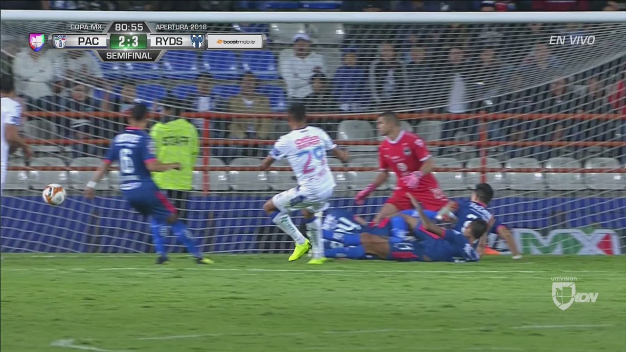 La tuvo Jara frente al arco pero no pudo darle dirección de gol. Esto sigue: Pachuca 2 – 3 Rayados.