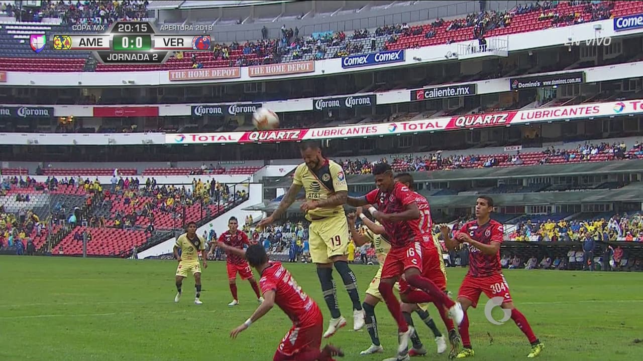 César Ramos Palazuelos evita el festejo azulcrema y marca falta de Víctor Aguilera en el área previo al remate de gol.