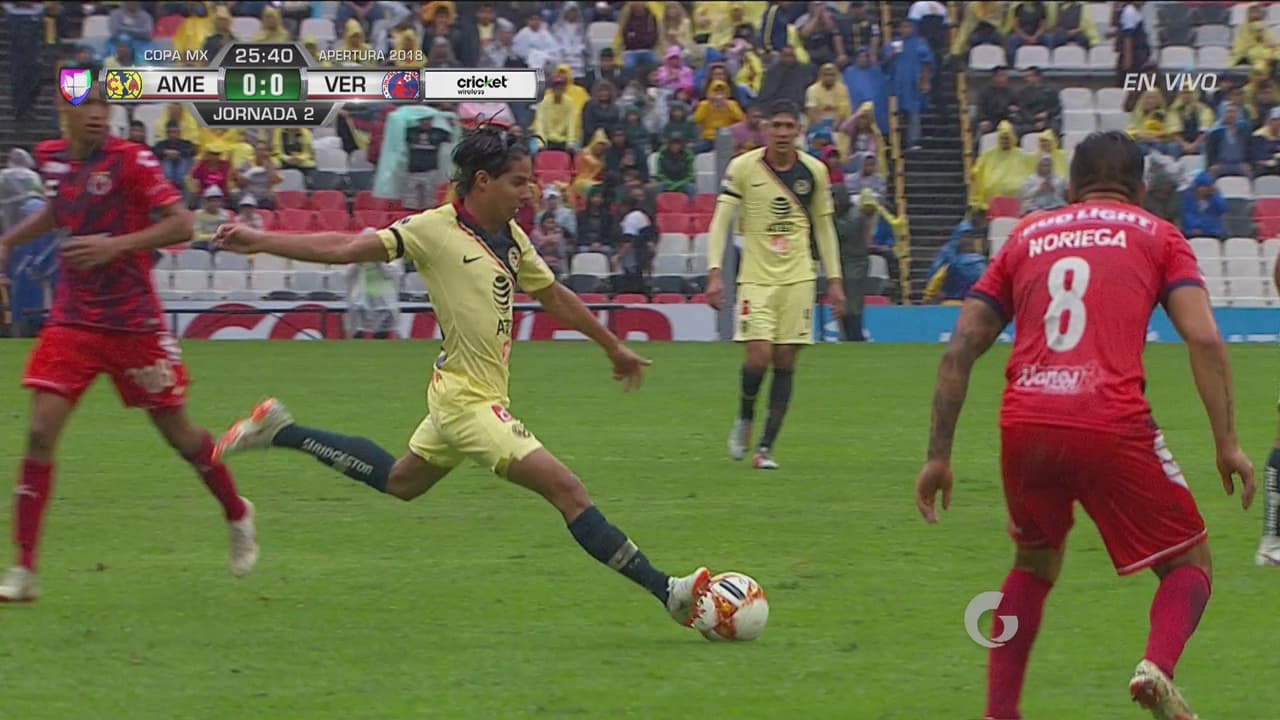 Las Águilas quieren hacer valer su localía y abrir el marcador ante Veracruz, pero el disparo de Diego Lainez queda por fuera del marco de Melitón.