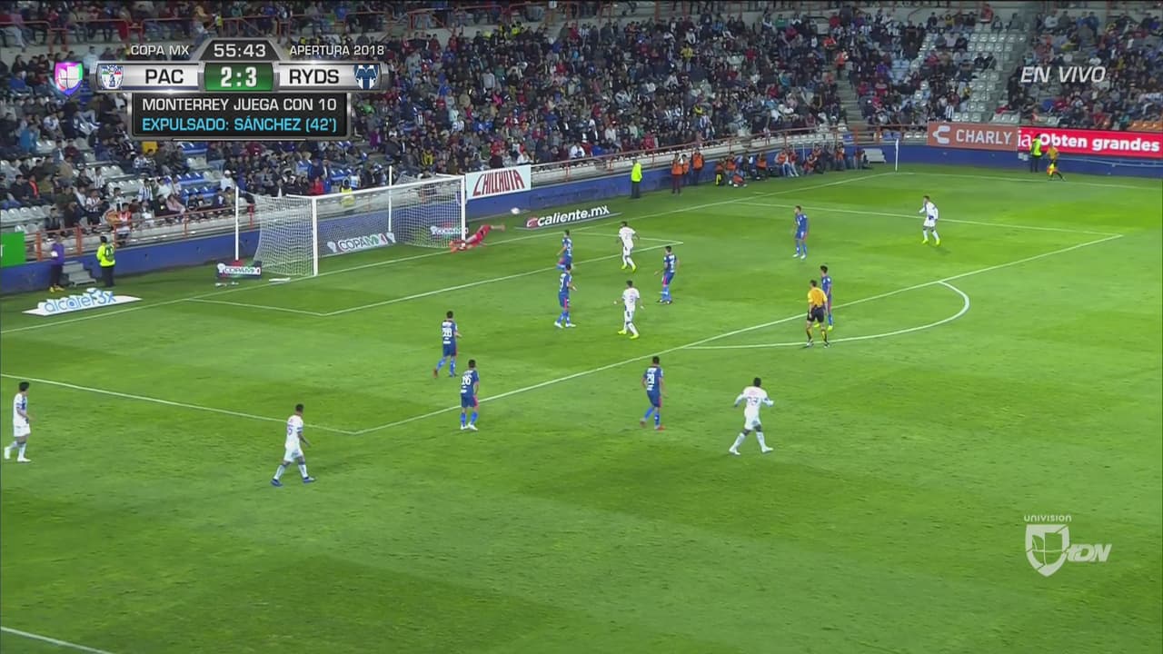 Palacios la ‘cacheteó’ buscando sorprender a Carrizo, que reacciona a tiempo y con una mano saca al tiro de esquina.