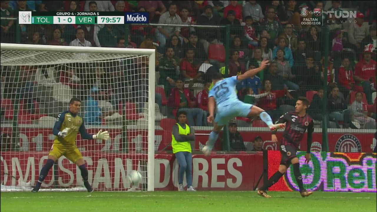 El volante del Toluca se alzó por los aires y sacó el testarazo con mala puntería.