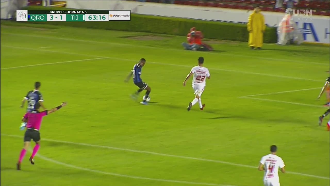 El joven Gerson Vázquez fusila dentro del área a Luis Michel para el 3-1 de Gallos Blancos sobre Tijuana.
