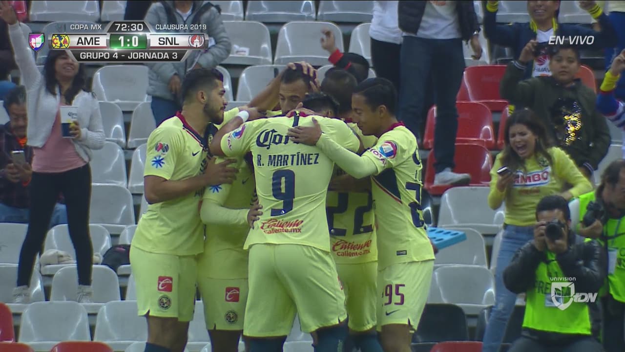 El ‘Machín’ Álvarez hace la diagonal, lo tropiezan y la principal marca el penal. Emanuel Aguilera ejecuta de forma magistral y anota. América 1 – 0 Atlético San Luis.