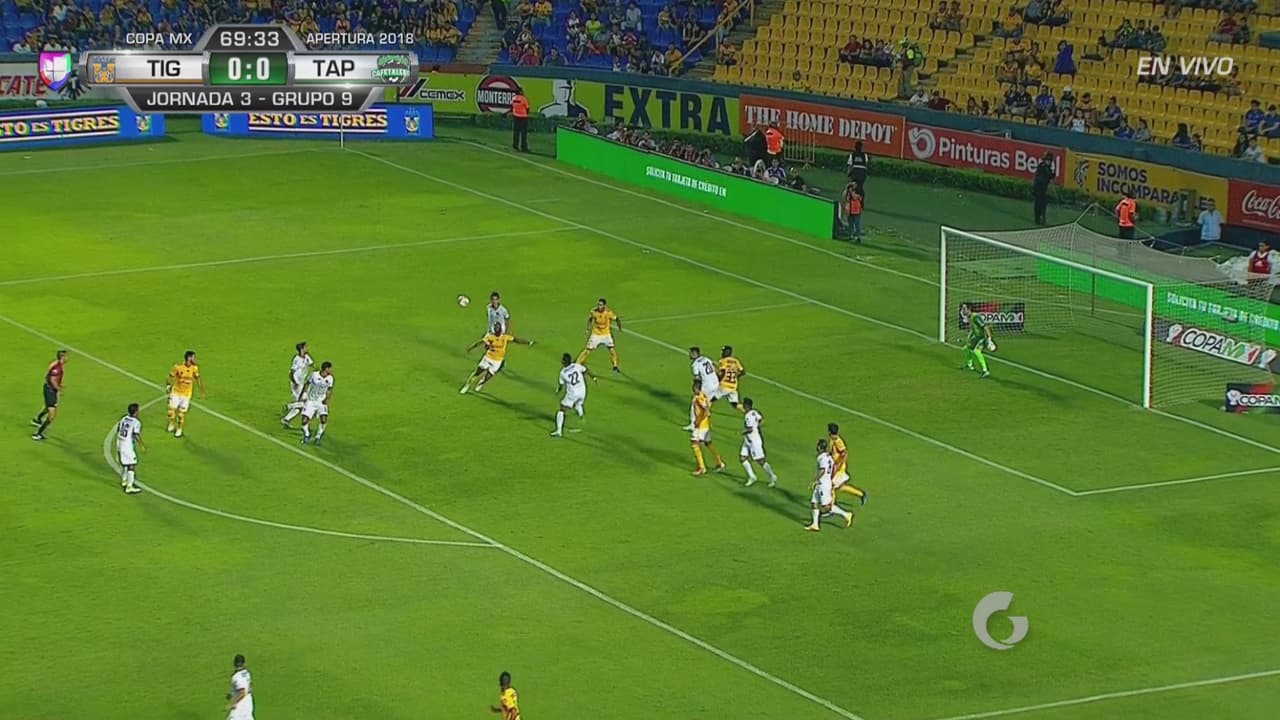 Al delantero ecuatoriano le quedó el balón en el área y sacó un remate acrobático que terminó pasando muy cerca del arco de Cafetaleros.