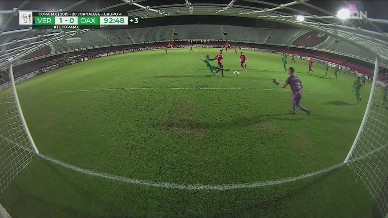 Centro al área, el remate de Raymundo Fulgencio que es bien contenido por César López.
