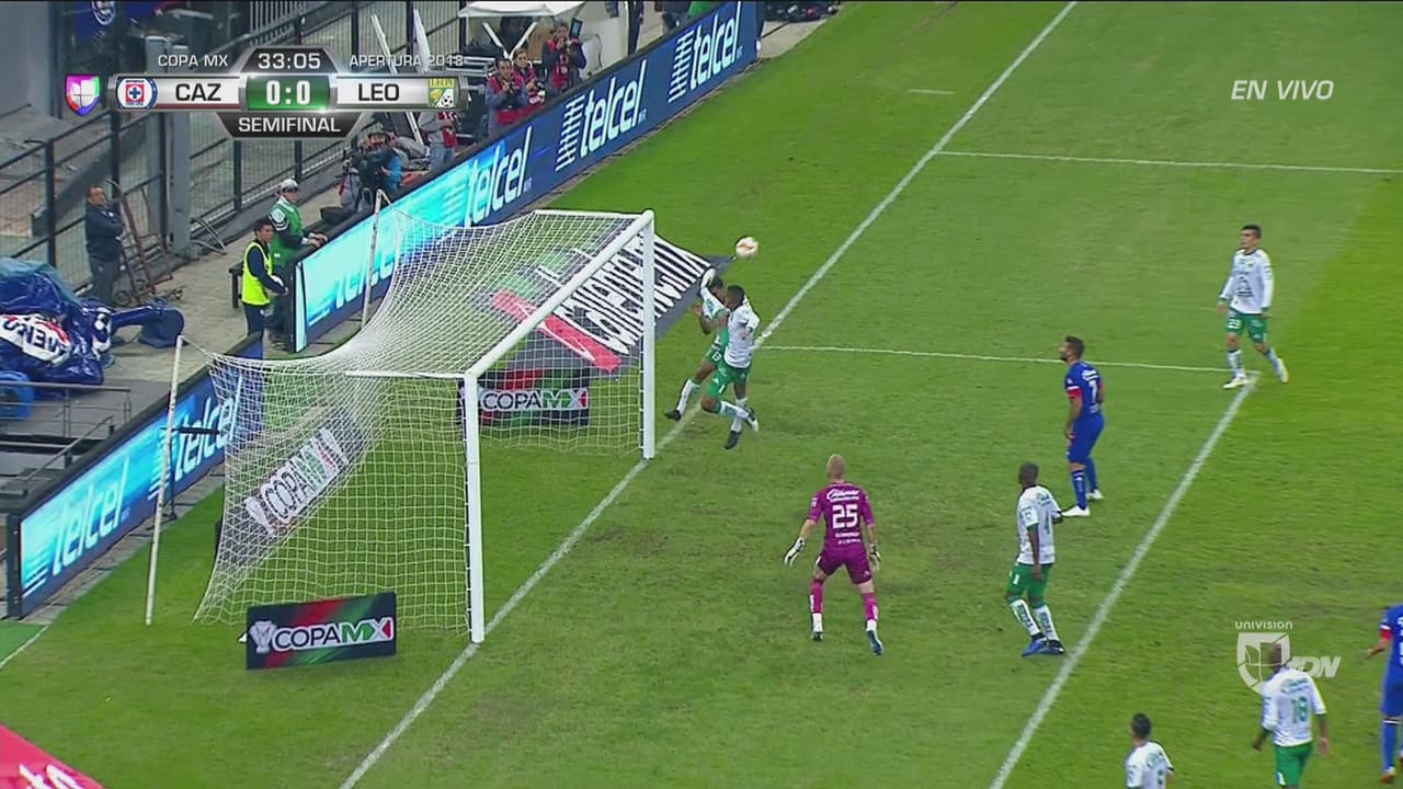 El defensor de León William Tesillo, salta y la saca con la punta del botín, cuando ya había el esférico había superado a Yarbrough.