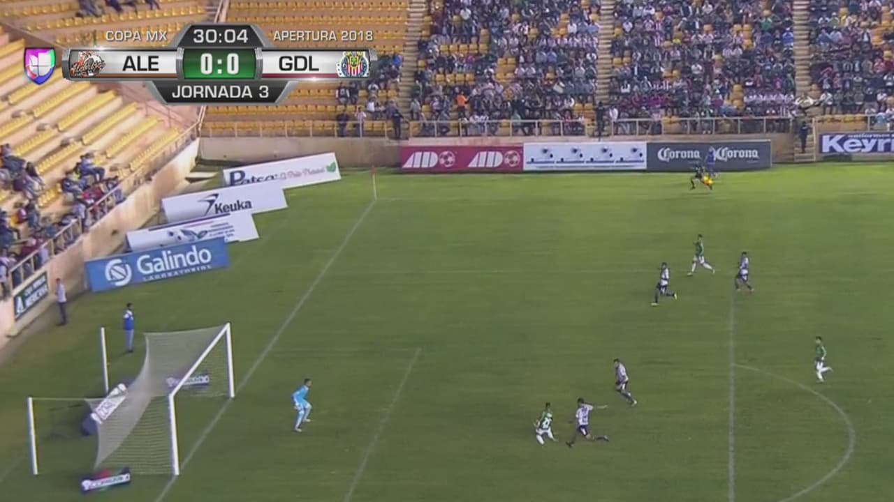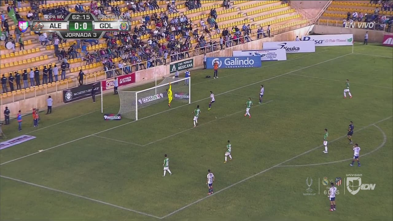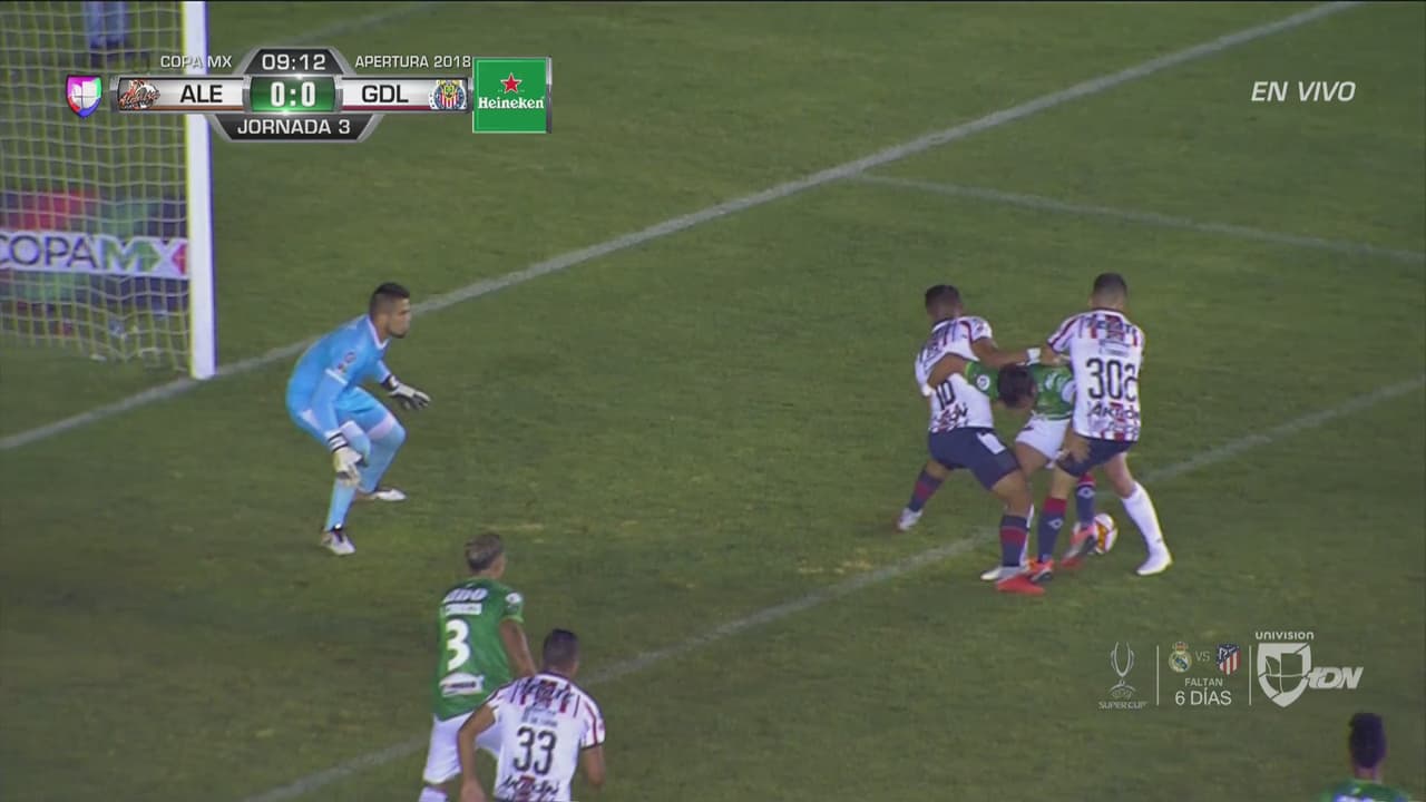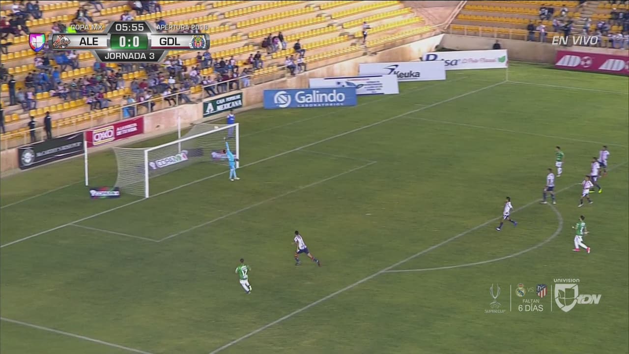 Vladimir Moragrega de Alebrijes se perdió un claro mano a mano con el portero de Chivas, quien achicó el ángulo de forma inmejorable.