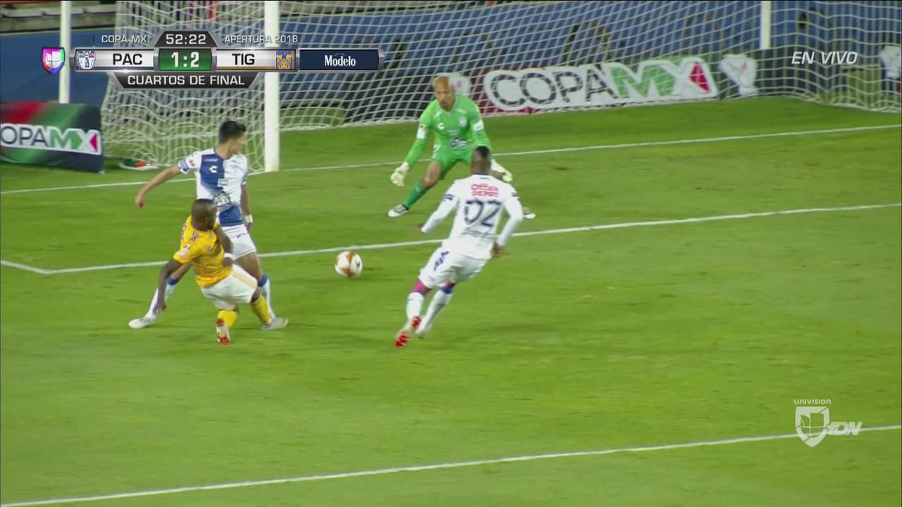 El ecuatoriano le ganó por velocidad a la defensa del Pachuca, encaró y disparó a primer poste pero se topó con la personalidad del veterano cancerbero. Tigres sigue dominando.