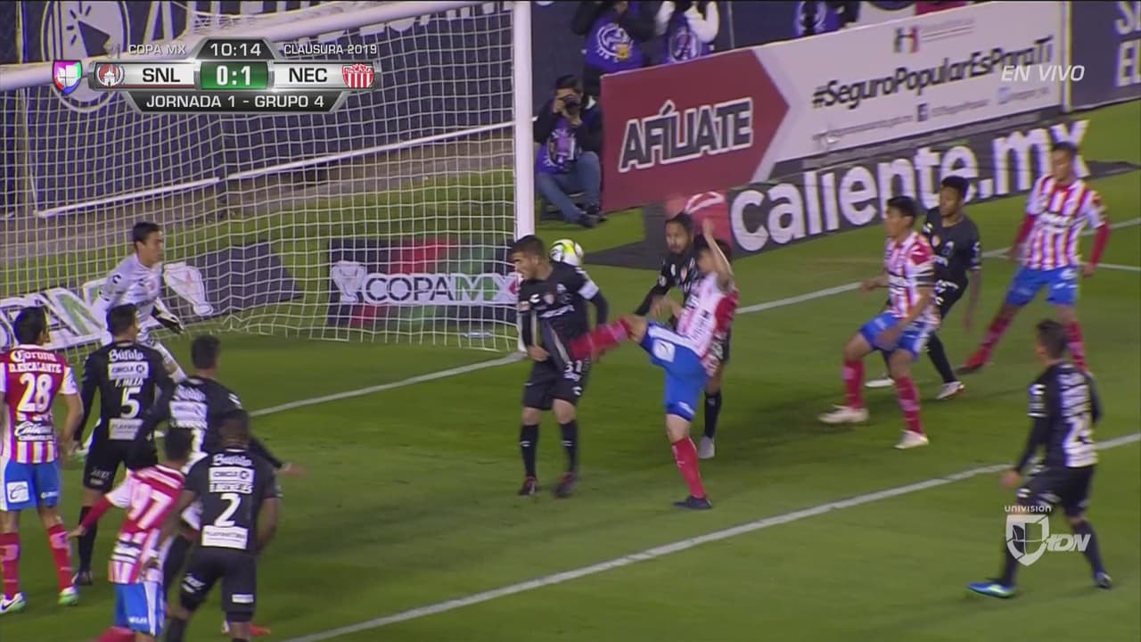 Un cabezazo parecía pegar en el brazo de un defensor del Necaxa. Los jugadores del San Luis reclamaron penal que el principal no cobró.