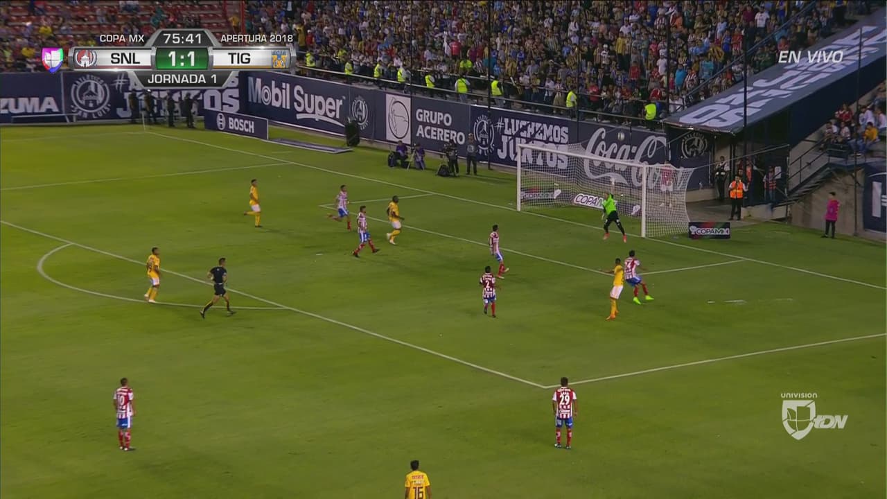 El atacante argentino de Tigres hizo una buena jugada personal pero le pegó muy abajo al esférico desperdiciando una buena oportunidad de retomar la ventaja en San Luis Potosí.
