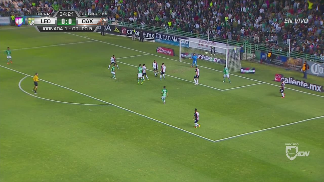 El volante de la Fiera quedó solo dentro del área pero remató a un lado tras la buena jugada de Mena y Vázquez por la banda derecha. Oaxaca da muchos espacios al local.