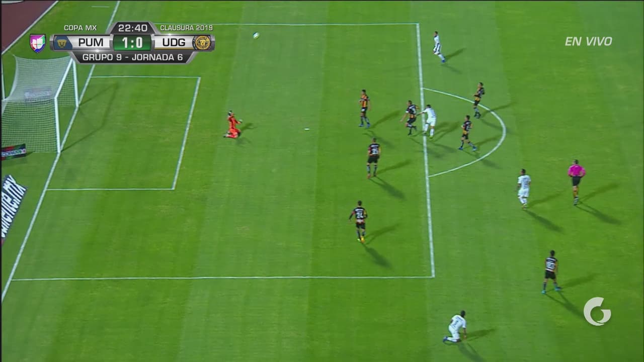 El argentino Juan Manuel Iturbe se dio la media vuelta en las afueras del áreas y pegó un potente derechazo que detuvo el portero de Leones Negros, Jorge Hernández.