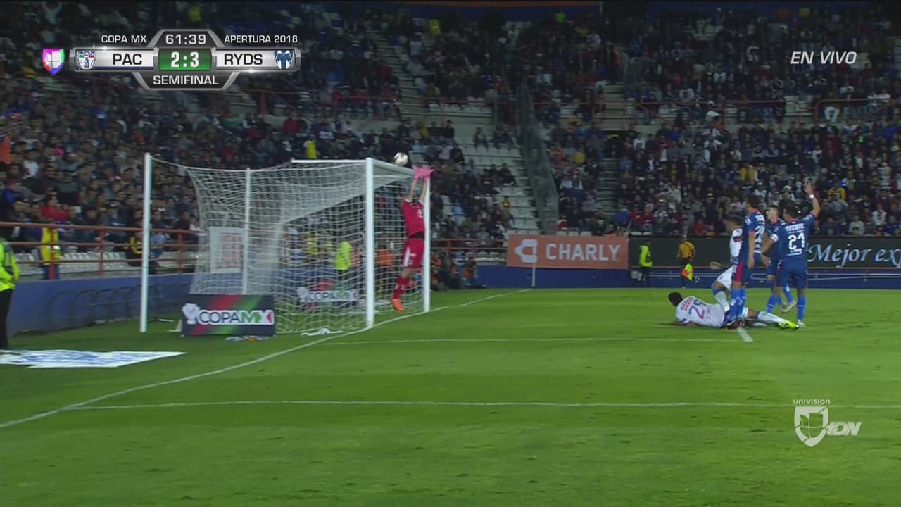 Franco Jara le ganó por el aire a la defensa de Monterrey y con cabezazo exigió al portero Carrizo, que le metió la mano al balón y lo mandó contra el poste horizontal.