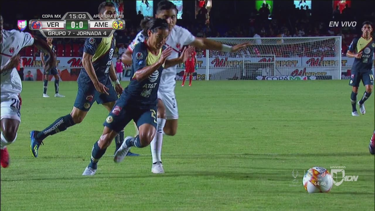 El delantero de las Águilas se quitó la marca al entrar al área de Veracruz y sufrió una aparatosa caída ante la salida de Jurado.