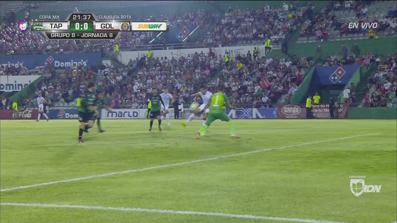 El delantero de Chivas recibió en el área, disparó, pero el portero de Cafetaleros achicó de gran forma para evitar el gol.