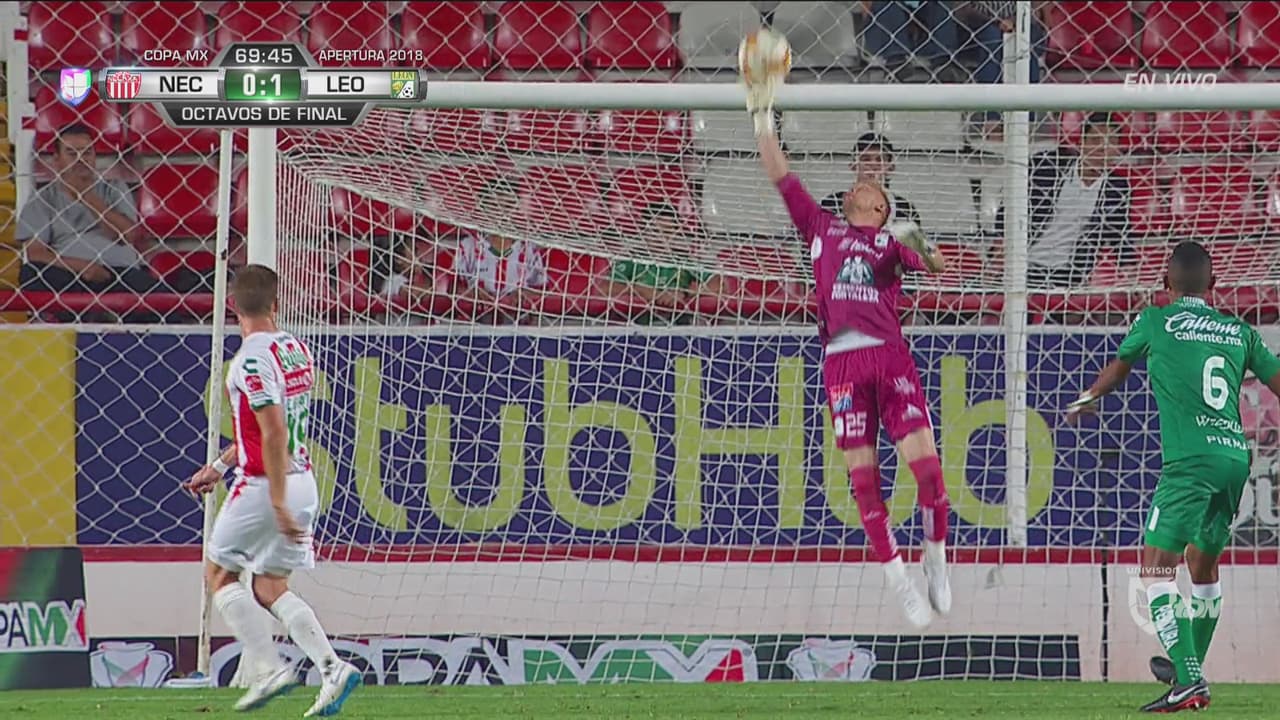 Por poco Claudio Riaño sorprende al portero del León que recurrió a un manotazo para mandar a tiro de esquina el cabezazo del argentino.