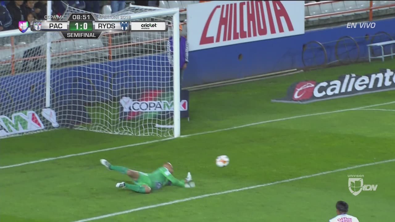 Gallardo se abre camino y saca el remate abajo, el arquero de los Tuzos logró rechazar con una mano para mantener el arco en cero.