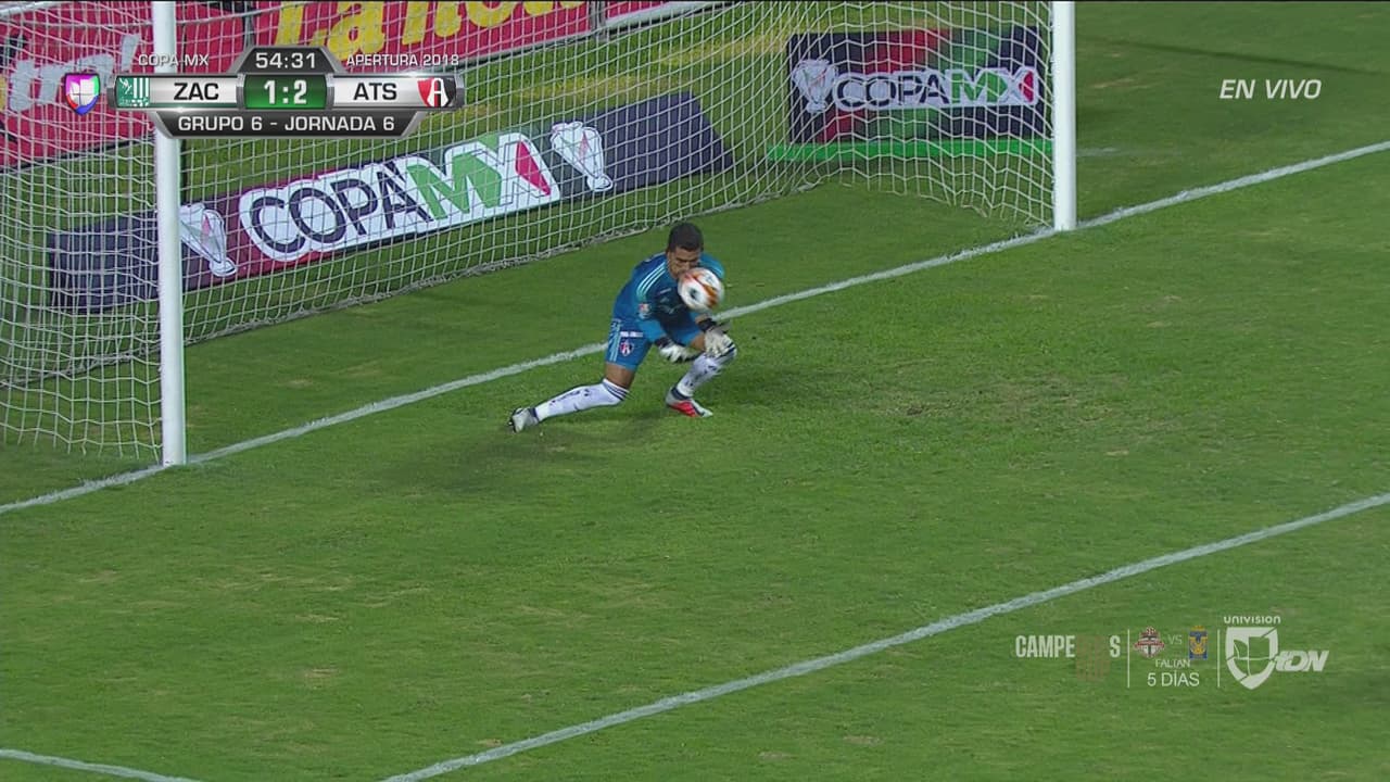 Oscar Macías saca disparo que se estrella en la cara del arquero Rojinegro.