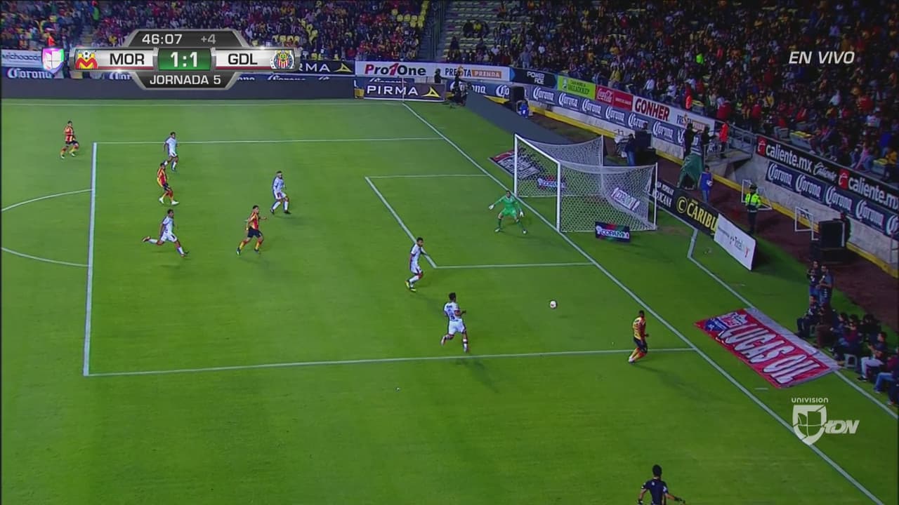 El zaguero de Chivas intentó cortar un centro, pero le metió la pierna y casi la pone en el ángulo de su propia portería.