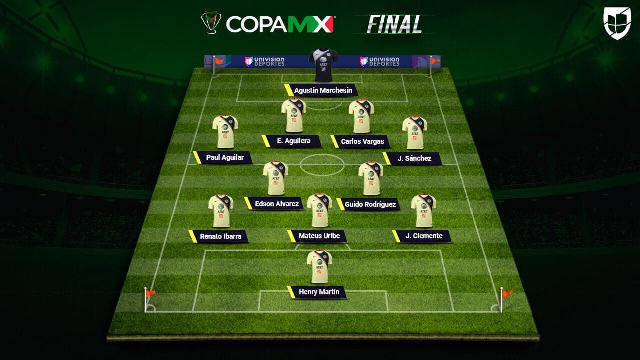 PROBABLE XI DE AMÉRICA: Marchesín, Vargas, Sánchez, Álvarez, Aguilera, Paul, Rodríguez, Bendetti, Mina, Clemente y Martin.