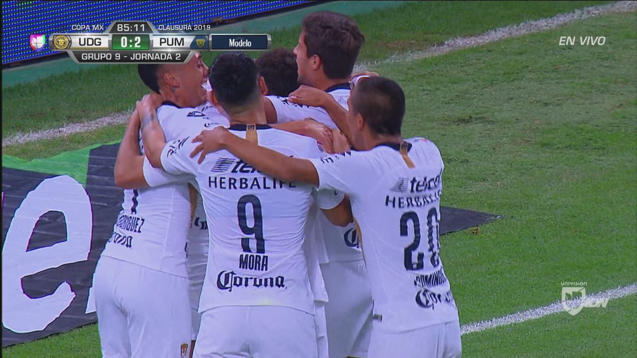 Pumas logró la primera victoria del 2019 al vencer este miércoles a Leones Negros 2-0 en el Estadio Jalisco en partido correspondiente al grupo 9, con los goles de Felipe Mora y de Ignacio Malcorra.
