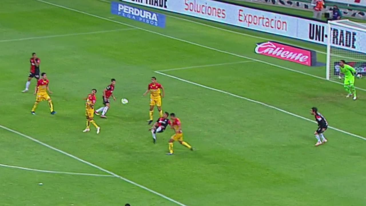 El mediocampista del Atlas hizo una gran pirueta y su remate se fue muy cerca del palo derecho de Florencio Morán.