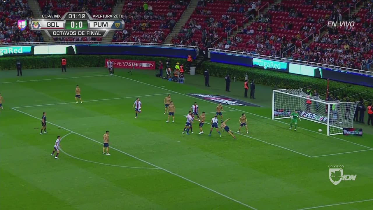 El central de Chivas apareció en el área, remató, pero su cabezazo se fue apenas abierto de la cabaña universitaria.