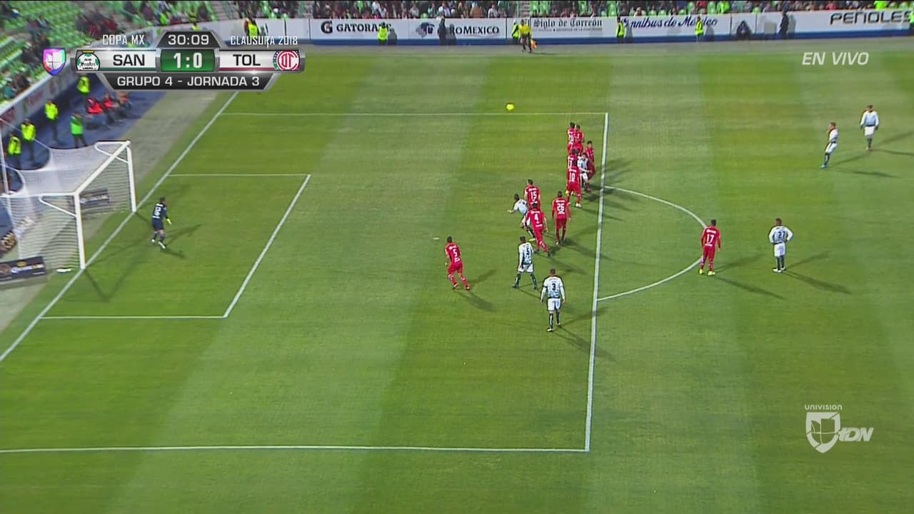 Brayan Lozano fue el encargado de poner el 1-0 para Santos en el primer tiempo luego de un magistral cobro de tiro libre que entró pegado al poste de la cabaña escarlata.