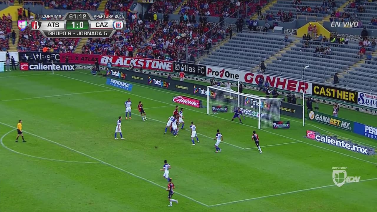 Gran remate de cabeza dentro del área celeste, pero el balón se estrelló en el travesaño y después botó fuera de la línea de gol.