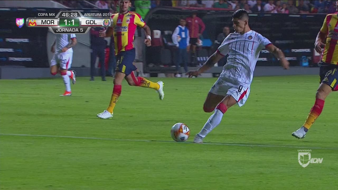 Gran pase filtrado del canterano Beltrán, Pulido definió de primera y el balón se fue apenas desviado de la portería purépecha.