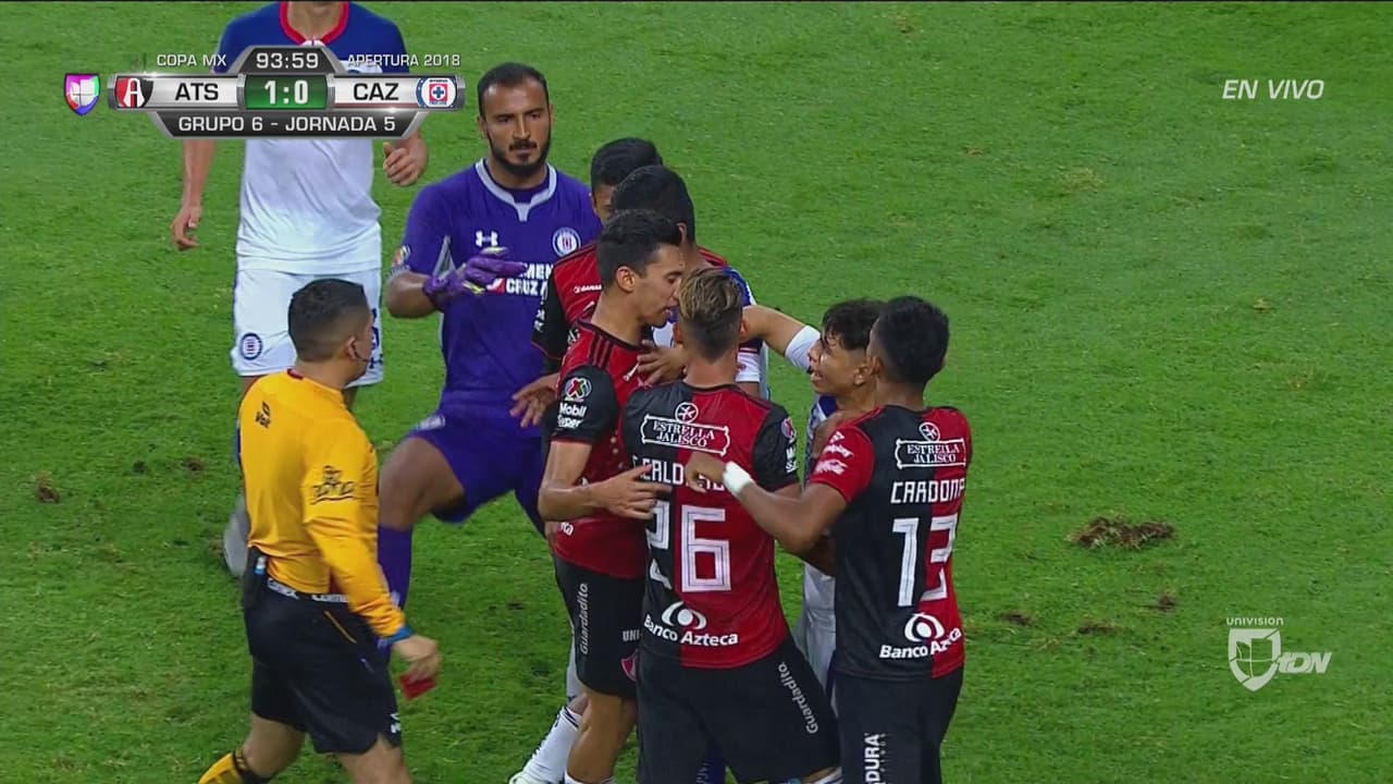 El jugador de Cruz Azul le pegó una patada por detrás a Vigón y vio la tarjeta roja directa. Mientras salía del campo, integrantes de ambos equipos se fueron a los empujones.
