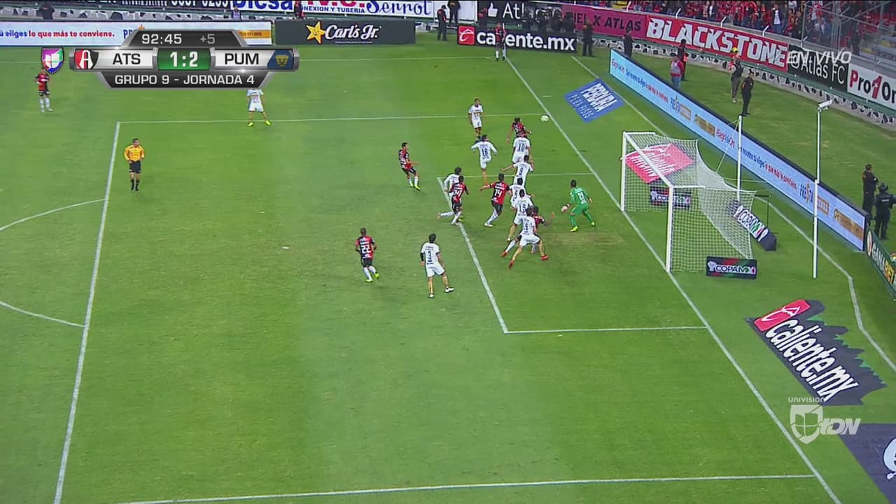 En un saque de esquina, Atlas buscaba dar un poco de su propia medicina a Pumas pero el esférico se fue por encima de la portería.