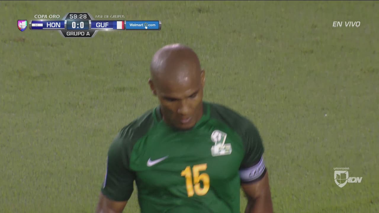El futbolista de Guayana Francesa sacó un riflazo que amenazaba con terminar en el fondo de la portería, pero el portero catracho reaccionó de buena forma.