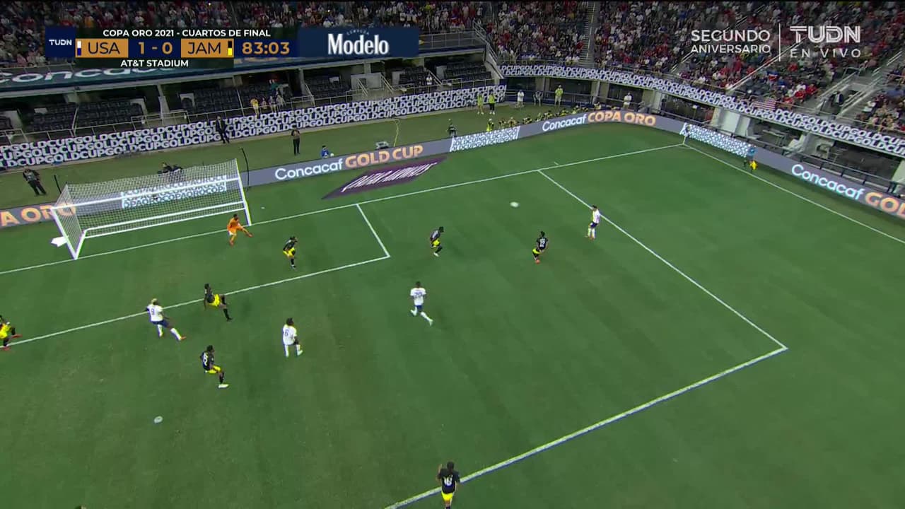 ¡Gol! Estados Unidos (Selección de futbol) 1| Jamaica 0. Matthew Hoppe (Estados Unidos (Selección de futbol)) disparo de cabeza a quemarropa desde el lado izquierdo.