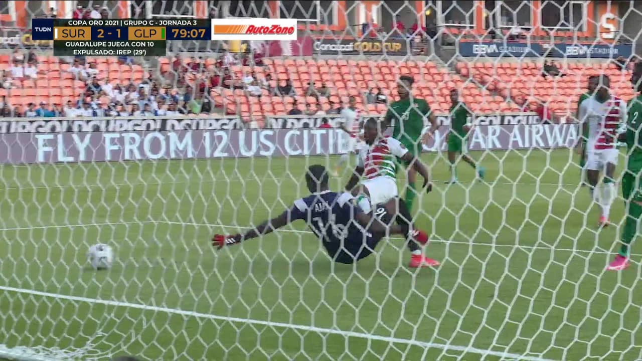 ¡Gol! Surinam 2| Guadalupe 1. Nigel Hasselbaink (Surinam) Disparo con la derecha a quemarropa desde el lado derecho.