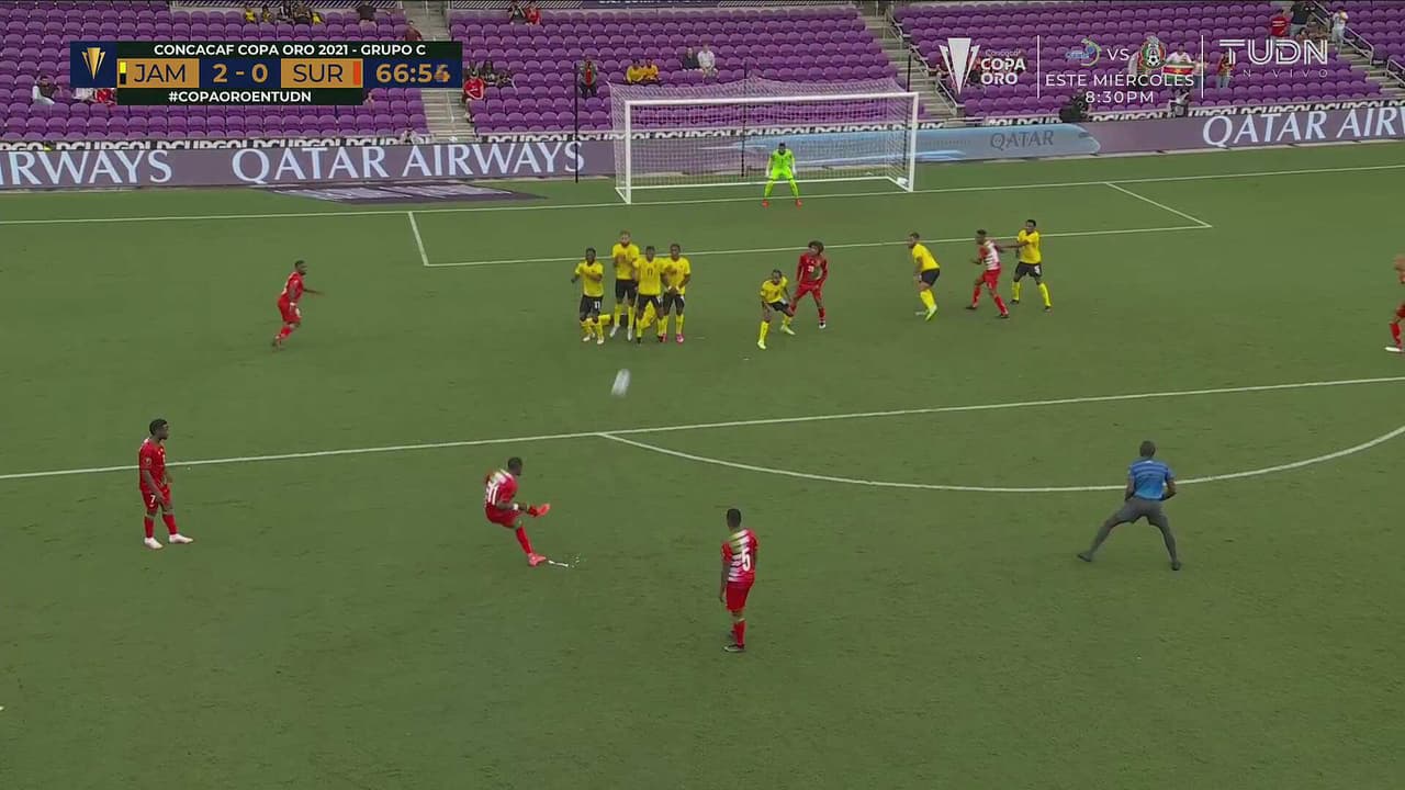 El delantero de Surinam cobró el tiro libre y le llegó a un par de aficionados que aguantaron el tiro al 66’.