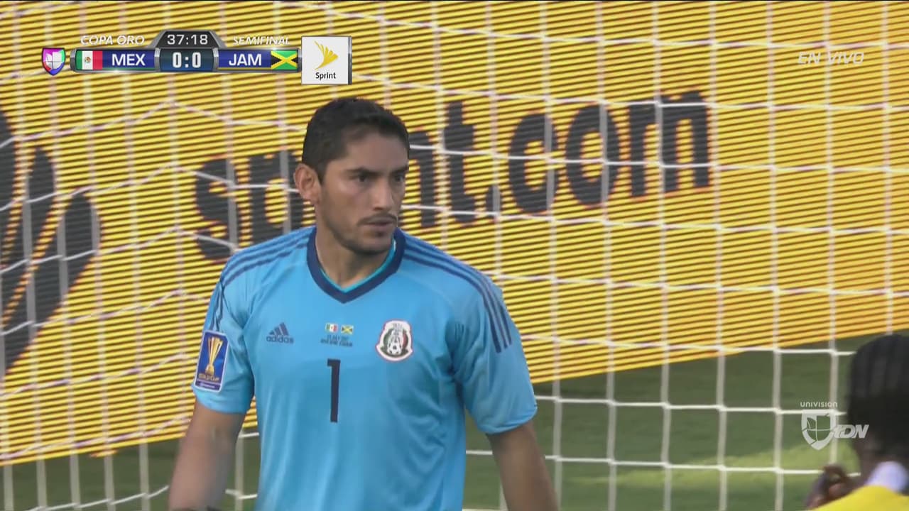 Disparo de tiro libre directo y el arquero mexicano desvió muy atento a tiro de esquina.