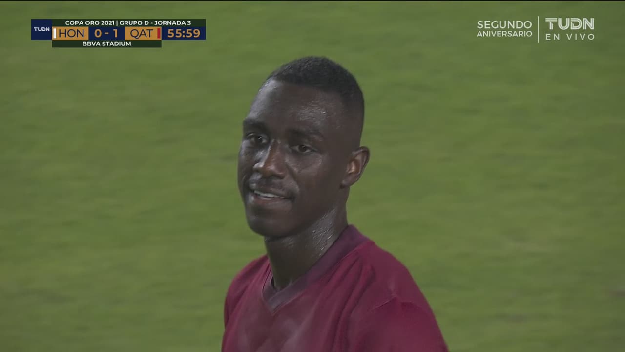 La defensa no puede rechazar el centro y el delantero de Qatar remató afuera al 55’.