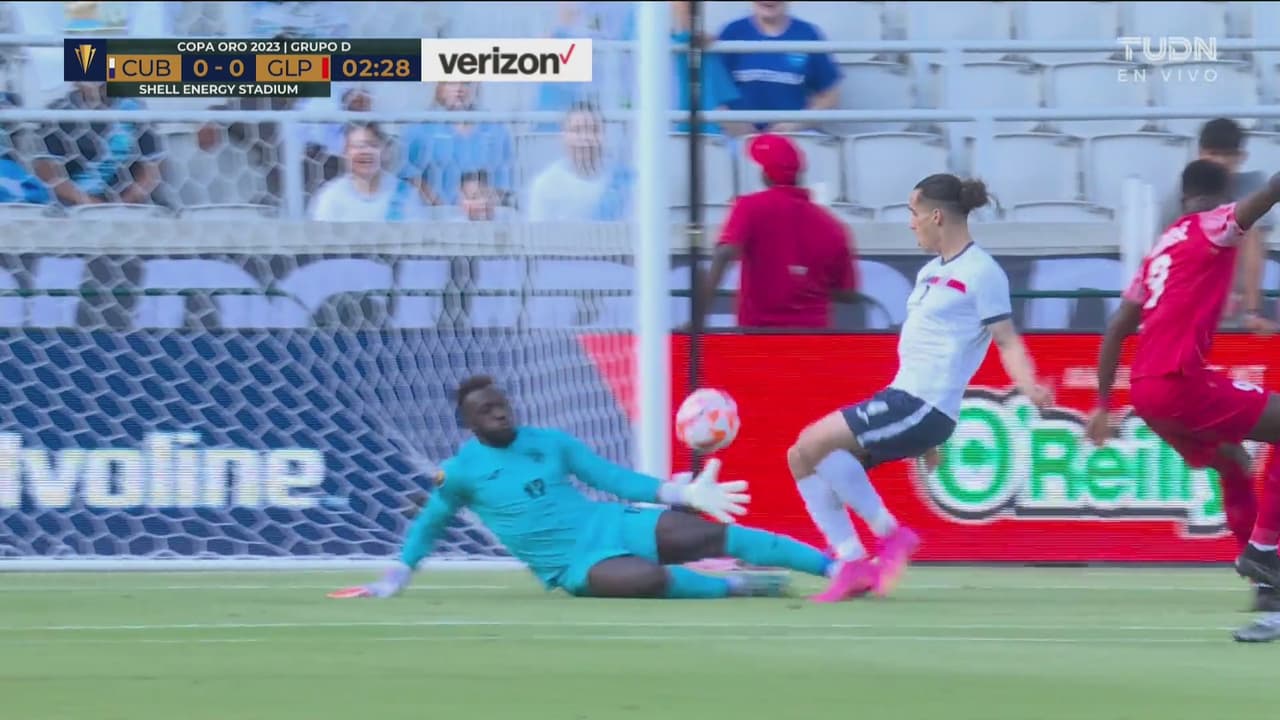 La defensa del equipo caribeño se mete en problemas y el guardameta cubano rechaza el disparo de Ambrose.