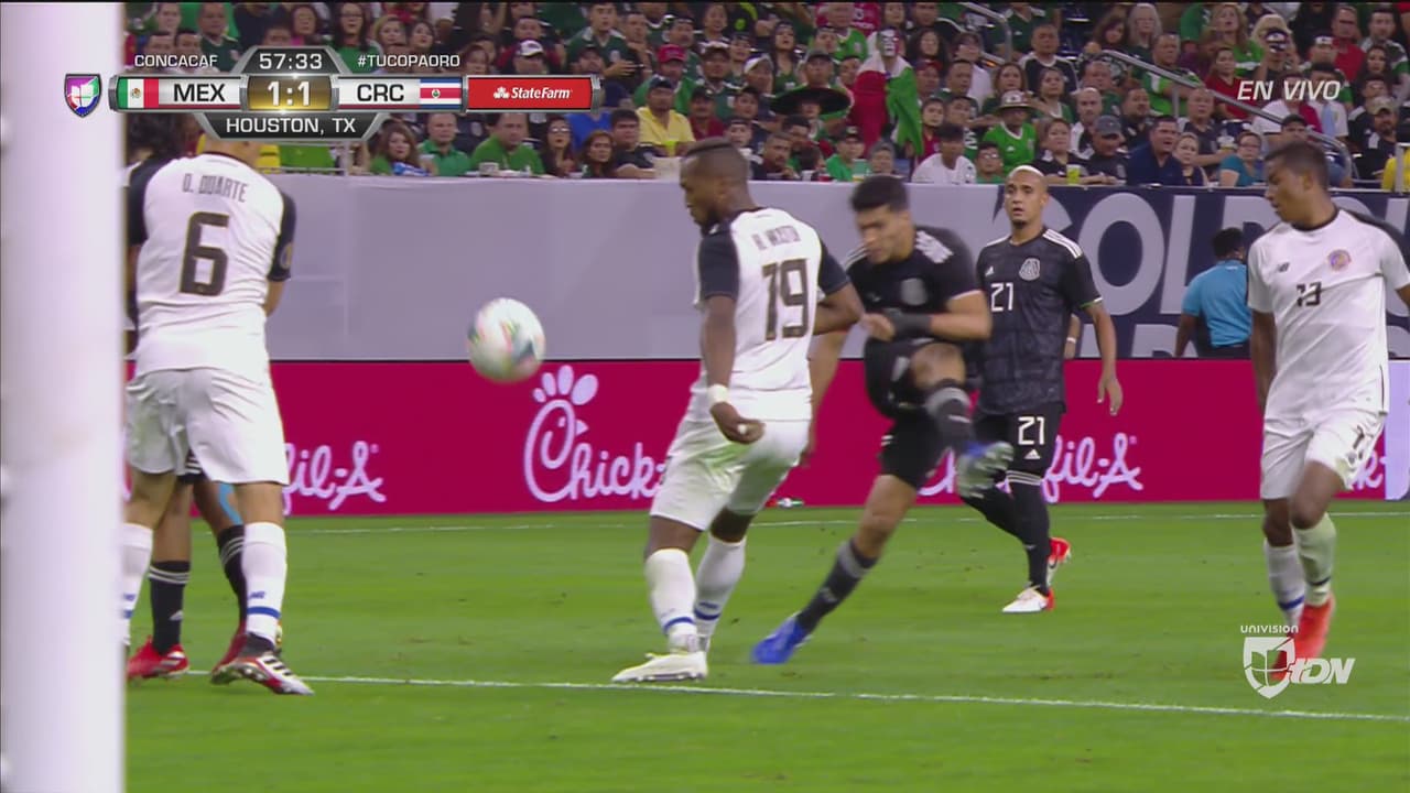 Riflazo del mexicano y el portero Moreira vuela para mandar a córner.