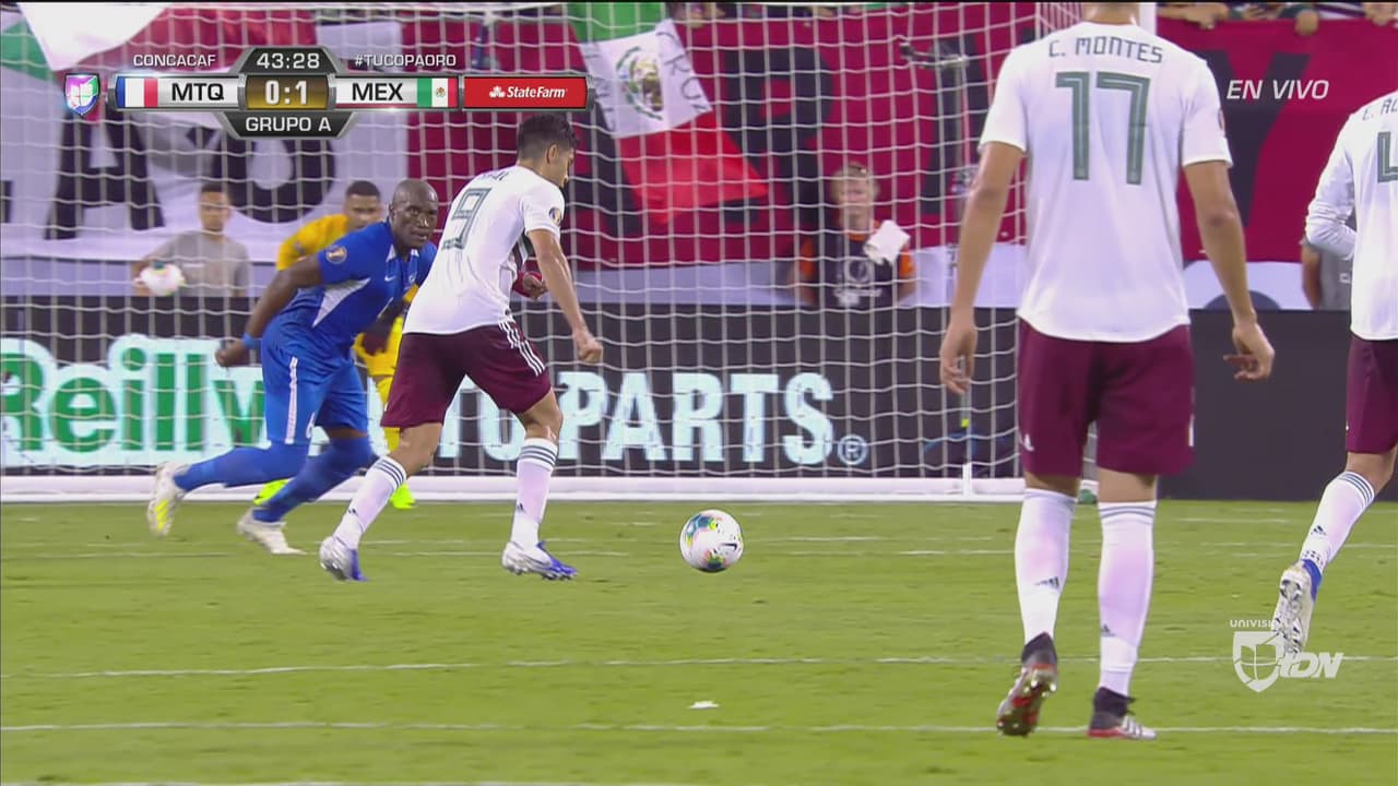 Atajadón del arquero de Martinica impidiendo la anotación del mexicano.