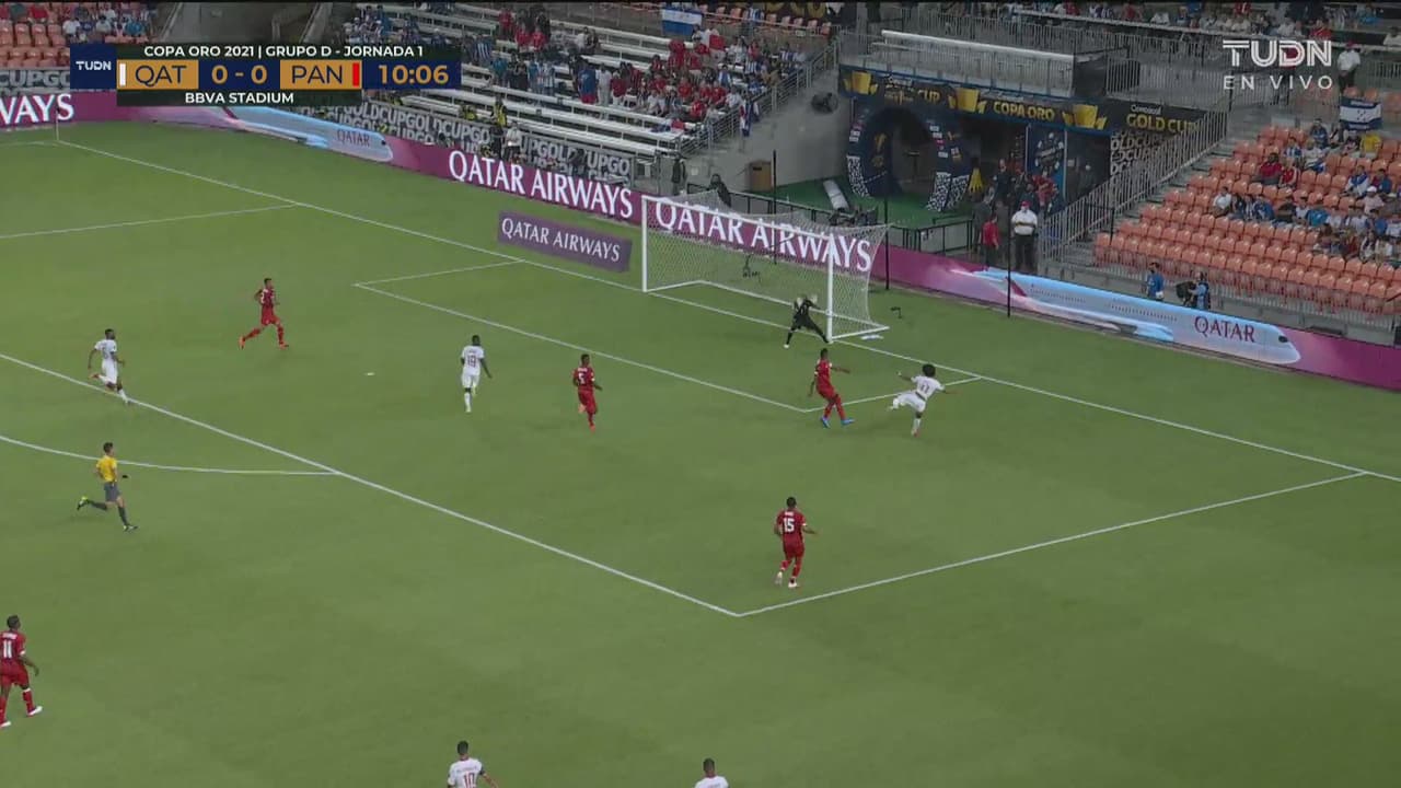 El atacante de Qatar se escapó y mandó un disparo potente, pero el portero de Panamá desvió al 10’.