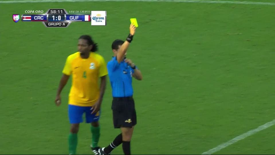 Tarjeta amarilla. El árbitro amonesta a Anthony Soubervie de French Guiana