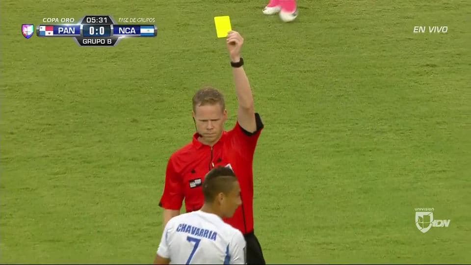Tarjeta amarilla. El árbitro amonesta a Carlos Chavarria de Nicaragua