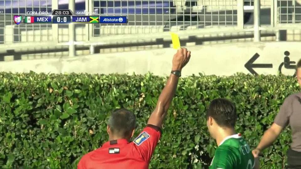 Tarjeta amarilla. El árbitro amonesta a Erick Torres de Mexico on July 23, 2017