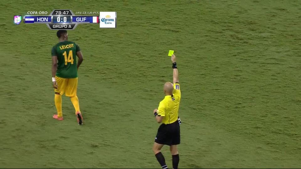 Tarjeta amarilla. El árbitro amonesta a Grégory Lescot de French Guiana