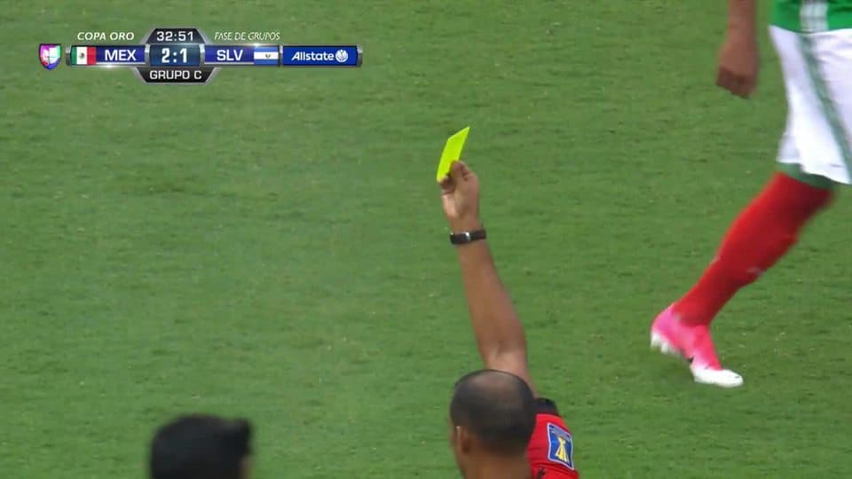 Tarjeta amarilla. El árbitro amonesta a Jorge Hernández de Mexico