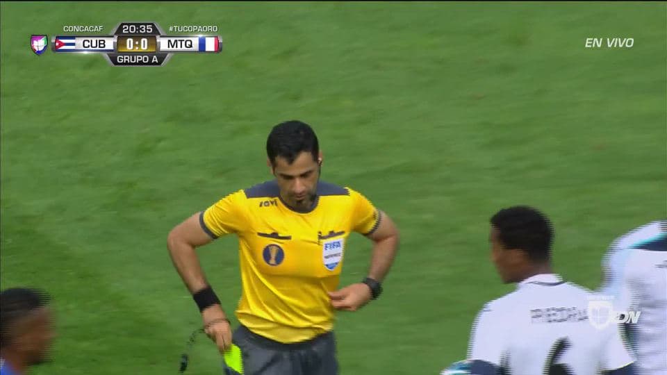 Tarjeta amarilla. El árbitro amonesta a Karel Espino de Cuba