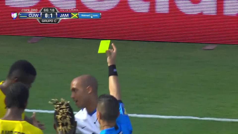 Tarjeta amarilla. El árbitro amonesta a Kemar Lawrence de Jamaica